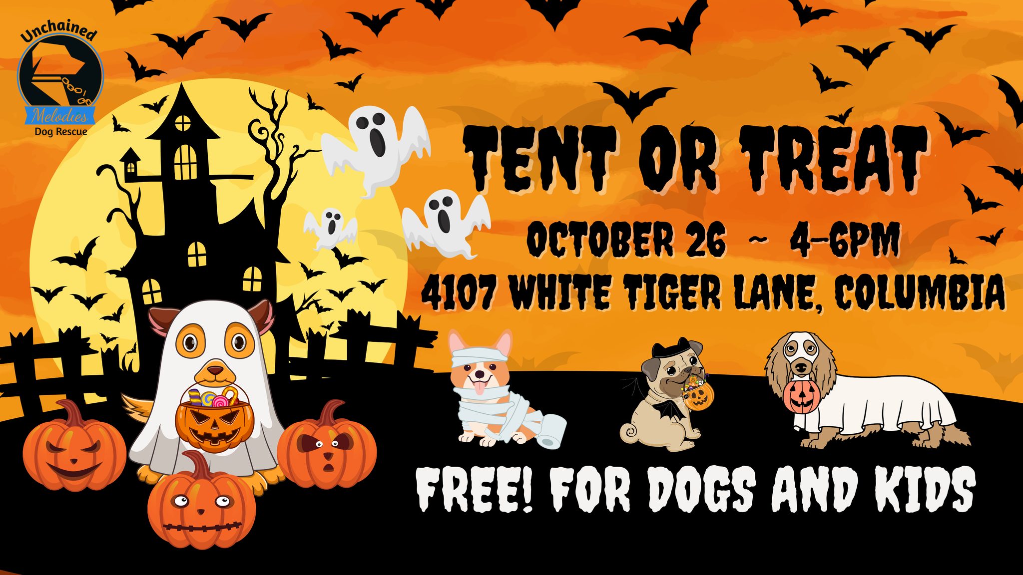 Join us for our annual halloween event for dogs and kids! This spooktacular will take place inside our training center to avoid any inclement weather. We will have lots of decorated tents in different Halloween themes for you to trick or treat at, a spooky Photo Booth and sooo many treats for both kiddos and dogs!